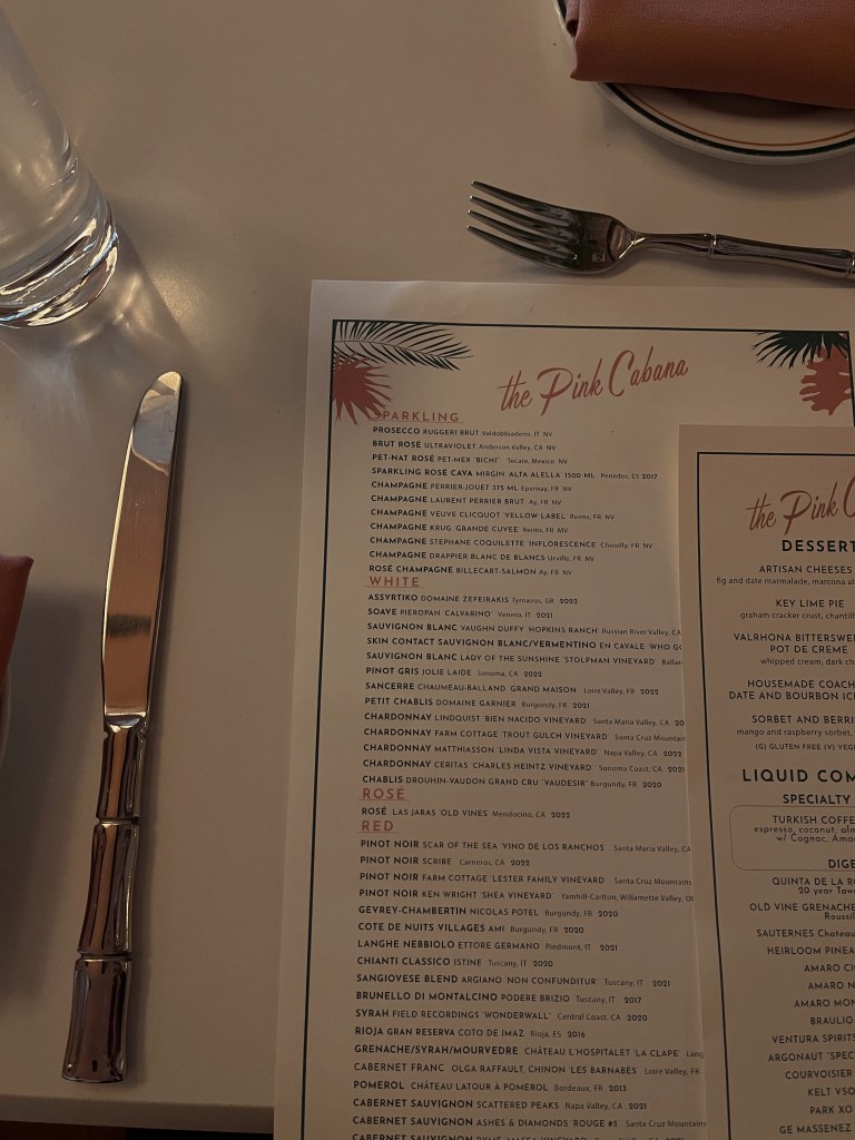 For on-site dining, the Pink Cabana channels the spirit of 1950s and ’60s Palm Springs tennis clubs, with a Moroccan twist. The space blends desert glamour with Mediterranean influences, with their menu offering fresh seafood, salads, and shareable plates that feel light yet indulgent at the same time.